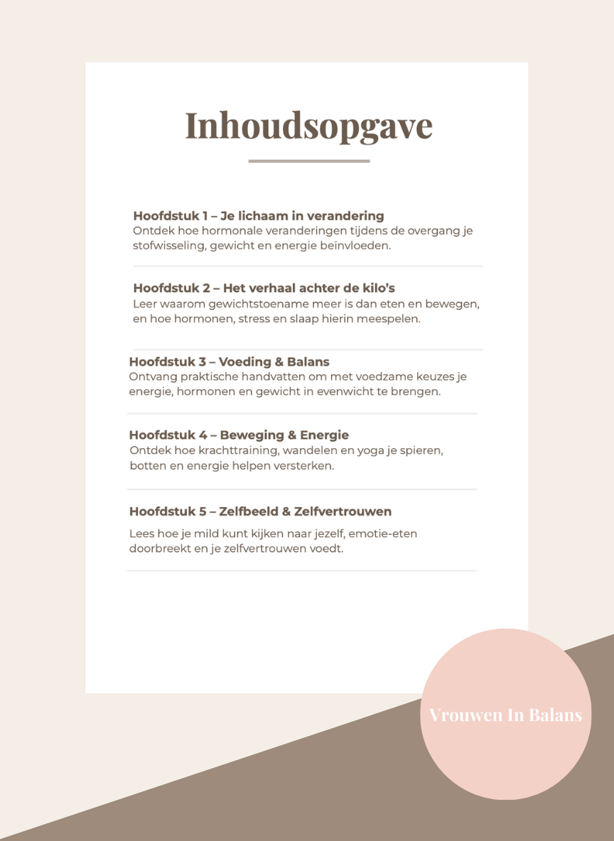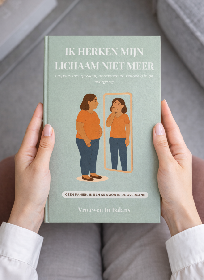 Ik herken mijn lichaam niet meer is een helder en mild e-book voor vrouwen in de overgang die worstelen met gewichtstoename, veranderende energie en een negatief zelfbeeld. Het boek laat zien wat er écht gebeurt in je lichaam tijdens deze fase en waarom deze veranderingen geen kwestie zijn van falen of gebrek aan discipline.