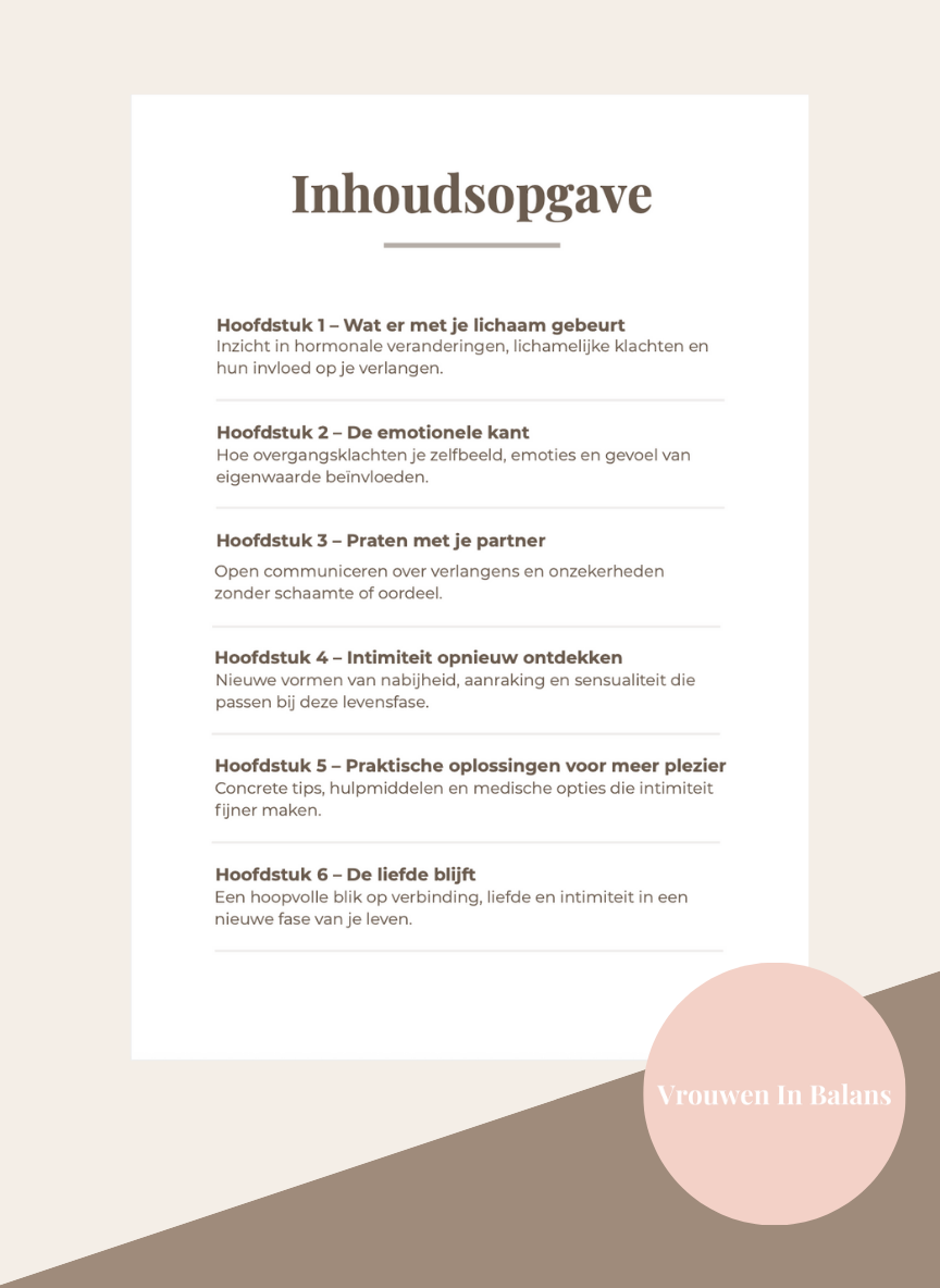 Dit e-book is er voor vrouwen die intimiteit niet willen opgeven, maar opnieuw willen ontdekken — op hun eigen tempo en voorwaarden.
